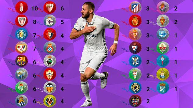 31 — Карим Бензема забивал в ворота всех 31 команд в Ла Лиге, с которыми ему доводилось играть.