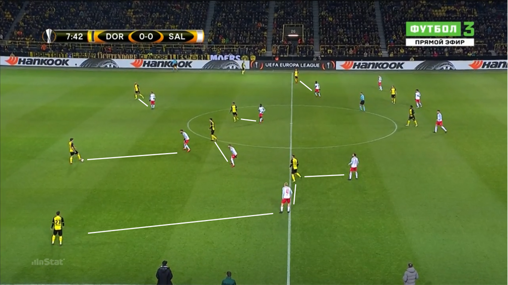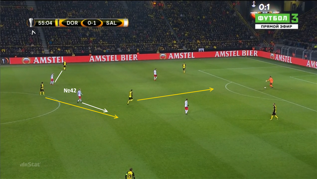 Но Зальцбург был на шаг впереди. Из-за того, что №42 остался на своей позиции, он спокойно мог контролировать действия Дауда, перекрыв ему линию для передачи. Это так же позволило игроку на фланге полностью сконцентрироваться на фулбеке Боруссии и не разрываться между Даудом и своим персональным оппонентом на фланге. Получив мяч, Вайгль не имел никаких вариантов.