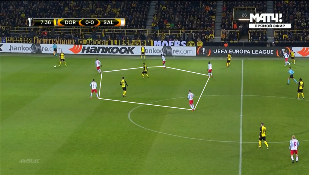 Проблема решалась благодаря смещению одного из фланговых полузащитников быков в центр. Это позволяло Зальцбургу активно прессинговать, не жертвуя при этом структурой обороны.