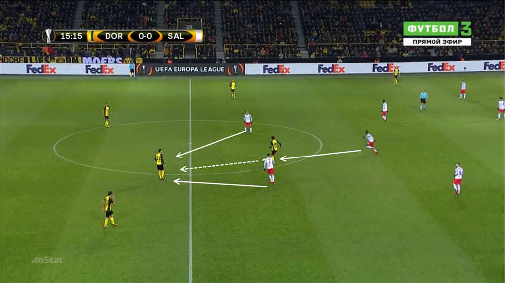Зоны на границе полуфлангов и центра поля – своеобразный пусковой крючок для активной фазы прессинга. Если кому-то из игроков Дортмунда удавалось получить мяч в той зоне, в которую на прошлом примере пытался ворваться Дауд, игроки Зальцбурга, как коршуны, накидывались на него, вынуждая действовать панически.