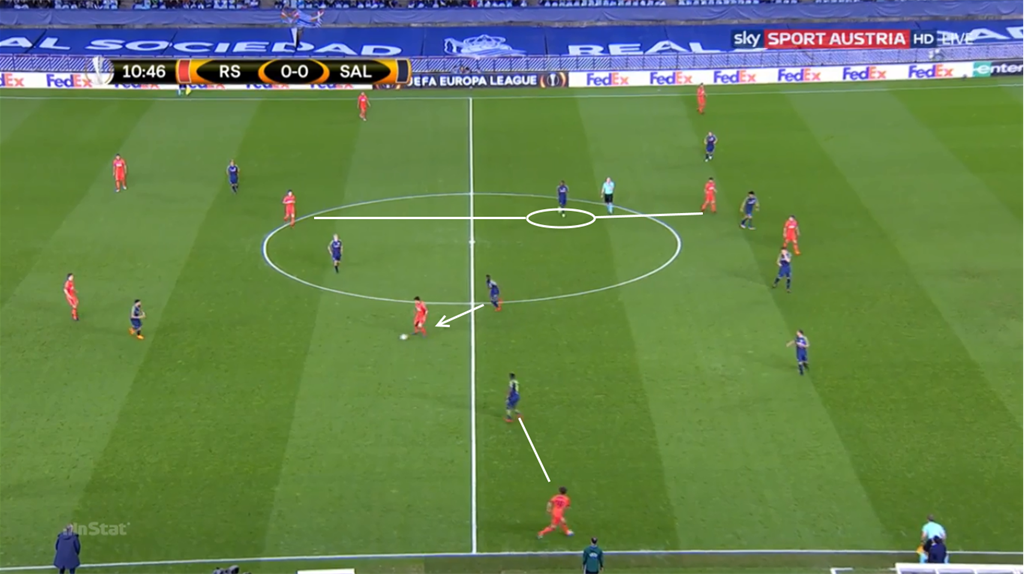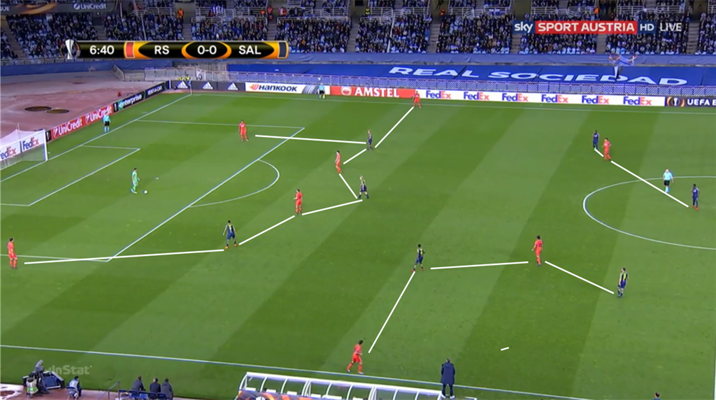 В 1/16 финала Реал Сосьедад пытался разрушить прессинг-план австрийцев, опустив дополнительного игрока из центра поля ниже. Испанцы рассчитывали поставить Зальцбург перед сложным выбором: если за этим игроком опускается кто-то из ЦПЗ "быков", то образуется свободное пространство в районе центрального круга, куда может стянуться игрок из группы атаки Реала. При втором варианте, Сосьедад просто получает на одного игрока больше при розыгрыше.