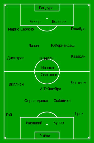 А вот с Шахтером ситуация обстоит несколько сложнее. Отметим, что Мирча Луческу не может рассчитывать на помощ ь целого ряда игроков. Рац, Чигринский и Степаненко еще не залечили травмы, а Жадсон, Алан Патрик и Морено еще не успели вернуться из расположения своих национальных сборных. Тем не менее, у румынского тренера Горняков настолько длинная скамейка запасных, что предугадать состав оранжево-черной команды весьма непросто. В воротах Шахтера сыграет Александр Рыбка, об этом Луческу заявил в предматчевом интервью. Справа в обороне незыблемо место капитана Горняков Дарио Срны, а вот на противоположном фланге, скорее всего, будет действовать Алексей Гай, которому на славу удался матч с Оболонью. Осмелимся предположить, что под нападающим, роль которого  исполнит Селезнев, сыграет Алекс Тейшейра. Эту позицию мог бы закрыть и Мхитарян, но все мы знаем, что Луческу в последнее время использует армянина исключительно в качестве опорника. Читается выход в основе Дентиньо, ставшего лучшим в поединке с Оболонью. Заменить бразилец может Дугласа Косту.