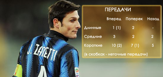 Атакующие действия – 8 баллов. При контрвыпадах нерадзурри мяч часто оказывался у аргентинца, и брака в его действиях было мало (82%; второй показатель в команде после Вальтера Самуэля среди тех, кто провел на поле весь матч). Дзанетти практически в каждом из таких моментов удавалось найти свободного партнера впереди, а не тормозить атаку. Учитывая его позицию на поле, Хавьер считанные разы доходил до штрафной соперника, по воротам не бил – он выступил в роли своеобразного связующего звена между группой обороны (куда можно отнести защитников и Камбиассо) и группой атаки (Милито, Паццини и Альварес). Как уже говорилось выше, одно из подключений Дзанетти привело к взятию ворот Аббьяти – конечно, налицо ошибка Иньяцио Абате, однако и капитан Интера проделал все на высочайшем уровне.