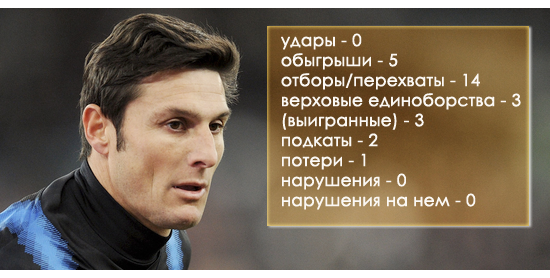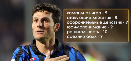 Командная игра – 9 баллов. Многие специалисты отметили, что одной из причин победы Интера в дерби стало как раз превосходство в командных действиях – нерадзурри действовали более слаженно, а вот игроки Милана часто брали инициативу на себя, что шло во вред атакующему потенциалу чемпиона. С этой точки зрения Дзанетти сыграл едва ли не идеально – мяч не передерживал, позволяя себе сольные проходы редко, но вовремя. Причем эффективность рейдов Хавьера близка к ста процентом. После одного из них и был забит победный гол.