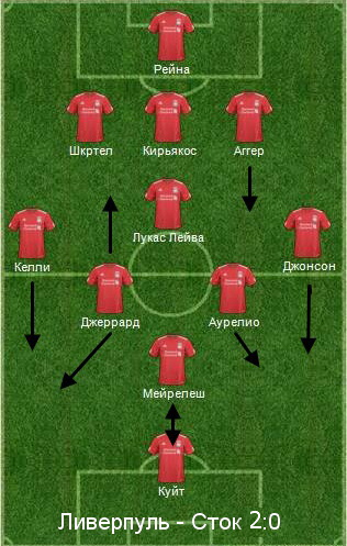 На деле все оказалось достаточно просто: три центральных защитника (справа налево - Шкртел, Кирьякос, Аггер), два бровочника (Келли справа, Джонсон слева), нетипичный ромб в центре поля (Лукас ближе к обороне, Аурелио и Джеррард по бокам, Мейрелеш во главе) и один-единственный Куйт в атаке.