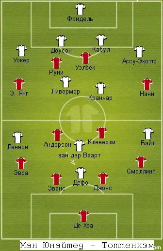 Реднапп заметно опоздал с заменами, ведь выход Хаддлстоуна и Павлюченко ожидался еще в перерыве. А когда они вышли, МЮ уже был на таком кураже, что остановить их было невозможно. Да и с ван дер Ваарта оказался такой же помощник при обороне, как и от Кранчара. Гол Андерсона стал настоящим украшением поединка, но действия центрбеков и центрхавов Шпор к этому вполне располагали. Гол Руни лишь закрепил тотальное преимущество Красных Дьяволов во втором тайме.