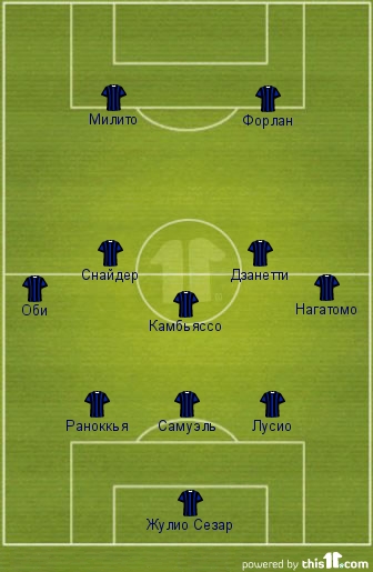 Вновь в ловушку был загнан Снайдер, который действовал левее в триумвирате центральных хавбеков и много внимания уделял работе сзади. Не все получалось у Форлана, который пока, кажется, еще толком не притерся к особенностям итальянского футбола. А о центрфорварде и говорить ничего не стоит - что Милито, что Паццини сезон начинают крайне слабо.