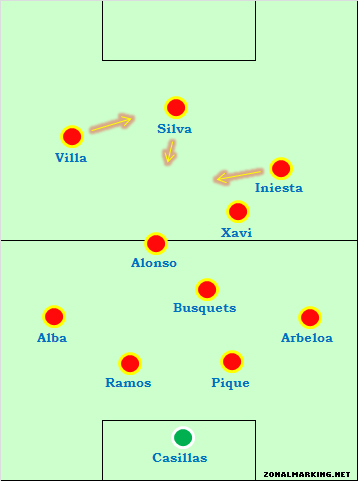 Небольшое изменение игрового рисунка сыграло важнейшую роль для победы Испании на чемпионате мира. Дель Боске понял, что команда не может обходиться без ширины, к тому же впечатлился выходом Хесуса Наваса на замену в первом матче. Давид Силва больше не сыграл на турнире ни минуты. Таким образом лишь один фланговый игрок был склонен к смещениям к центру (Иньеста), а на противоположной бровке выходил либо Навас, либо Вилья (когда на острие действовал Фернандо Торрес), либо Педро Родригес. Таким образом атаки испанцев становились более разнообразными - один из номинально фланговых игроков гарантировал доминацию в центре поля, а другой - ширину, постоянные забегания в чужую штрафную и обеспечение зазоров в оборонительных порядках соперника.