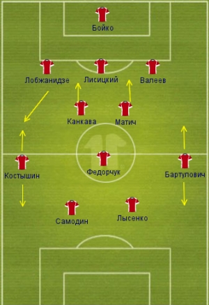 В подобной схеме 3-5-2 при обороне переходит в 5-3-2. Но фланговые игроки Кривбасса Костышин и Бартулович при всей своей универсальности все же больше полузащитники, поэтому в оборонительной фазе атаки "нужное" число защитников организовывали Матич и Канкава. Они постоянно отходили назад во время позиционных атак соперника, особенно это касается фланговых атак. Когда Лобжанидзе или Валеев выдвигались на фланг, то именно кто-то из опорных хавбеков старался занять их место в центре.