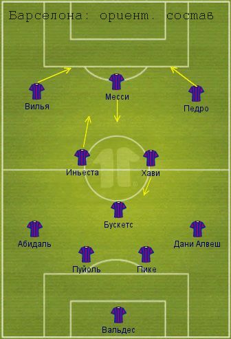 Прогноз Football.ua: Барселона будет играть по привычной по прошлым сезонам схеме 4-3-3 с быстрыми фланговыми игроками и Месси в роли "ложной девятки". В центре поля мы увидим безоговорочно основную пару центрхавов Хави-Иньеста и, скорее всего, Бускетса в роли опорного полузащитника. Четверка защитников, включая Дани Алвеша, будет действовать довольно пассивно в атаке, сосредоточив свое внимание на нейтрализации атакующего кулака Реала.