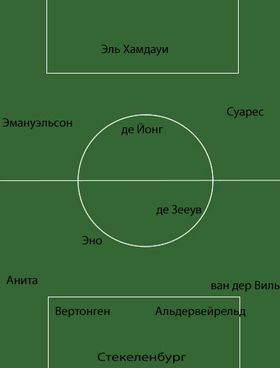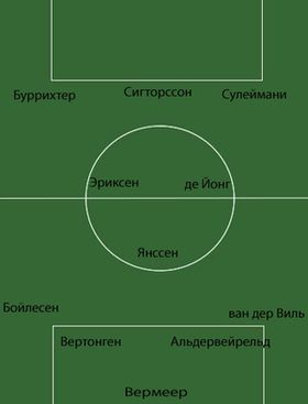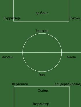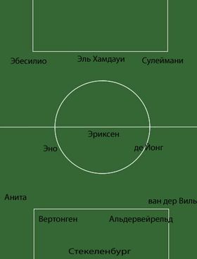На этом аналогии между Аяксом и Барселоной не заканчиваются. В отсутствие "тяжелых" форвардов, де Бур вынужден был выдвинуть на позицию центрального нападающего Николаса Лодейро, который, сродни Месси, исполняет роль "ложной девятки", активно поддерживая фланги и открывая зоны для рывков в штрафную действующему из глубины Кристиану Эриксену.