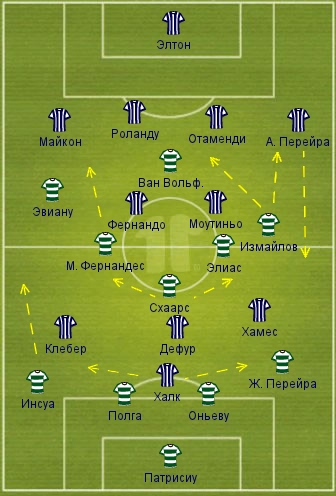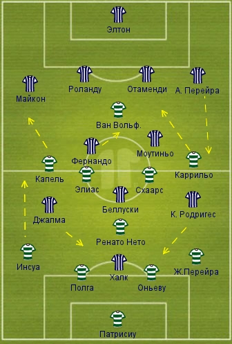 Расстановка Драконов, сыгравших в Кубке Лиги еще до нового года, походила на лиссабонские 4-3-3 с единственной поправкой на то, что в полузащите чуть глубже действовали два исполнителя: Фернандо и Моутиньо, а не один, как это было в случае с Ренато Нето. Ближе к атаке расположился Беллуски; трио нападающих составили Джалма, Кристиан Родригес и Халк, с последним на острие.