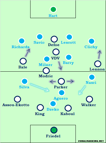 ионно направлены на разрушение. Однако итальянский менеджер поступил мудрее, отрядив в центр поля Милнера, что позволило его команде качественнее контролировать мяч в центре поля и продвигаться к штрафной соперника. Впрочем, наличие лишь одного «солдата» развязало руки креативным полузащитникам Тоттенхэма, которые успешно комбинировали в средине поля, хотя особых дивидендов из этого не извлекали. Не нашлось места в основе Балотелли, что с учетом важности Агуэро и «специализации» Джеко по Шпорам выглядело абсолютно естественно.