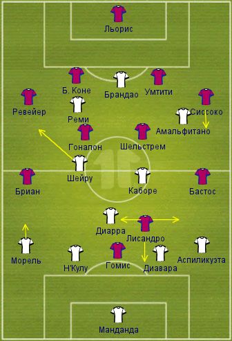 Для Лиона 4-4-2 в принципе не ново - Гард такую схему использовал не единожды и в чемпионате Франции, и в Лиге чемпионов. Многие ошибочно приписывают недавно доминирующему на внутренней арене клубу игру в четыре форварда, хотя на самом деле линии построения игроков прослеживаются достаточно четко - Бастос и Бриан приличное количество игрового времени проводят на своей половине поля и у центральной линии. Что касается Лисандро Лопеса, его нельзя отнести к игрокам, действующим преимущественно из глубины. В то время как, к примеру, Руни или Месси смело подпадают под определение "десятки".