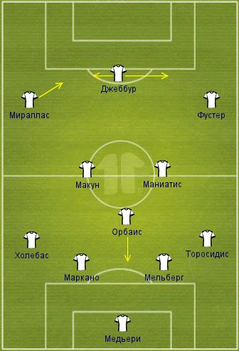 Защитная линия была составлена из четверки (справа - налево) Торосидис-Мельберг-Маркано-Холебас. При этом ситуативно, когда мяч оказывался