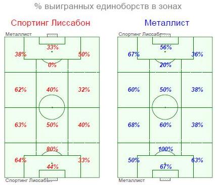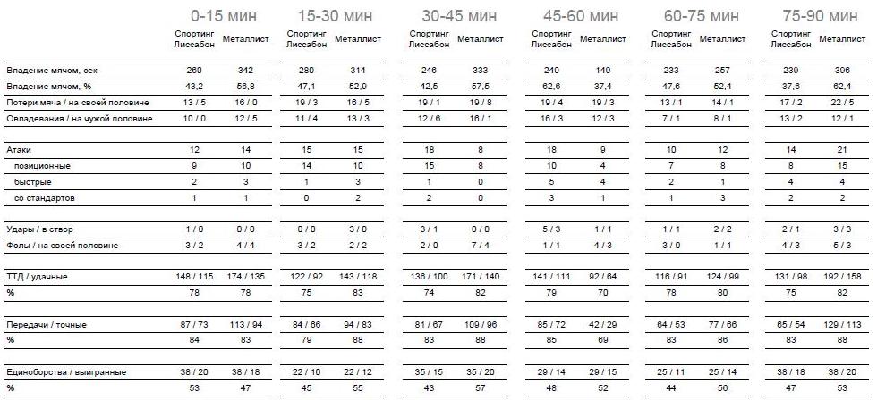 Статистика – вещь упрямая, и как бы уверенно Са Пинту, главный тренер Спортинга, не утверждал, что его команда сыграла намного лучше соперника, ряд цифр опровергают громкое заявление португальца. Помимо преимущества во владении мячом, харьковчане более чем на сто единиц превзошли лиссабонцев в количестве тактико-технических действий (896/714 против 794/607). Предпочтительнее смотрелась команда Маркевича и в передачах (564/481 против 466/385), среди которых было четыре острых, тогда как португальцы сподобились лишь на одну, впоследствии ставшую голевой. В данном контексте важно отметить, что игроки Металлиста чаще пасовали вперед, причем делали это успешнее (244/185 против 213/158), что свидетельствует о более вертикальной, ныне трендовой у прогрессивных команд, манере развития атак. Наконец, харьковчане хоть и ненамного (187/99 против 187/88), превзошли соперника в единоборствах, что в совокупности с вышеперечисленными факторами представляет более-менее отчетливую картину о реальном положении дел на футбольном поле.