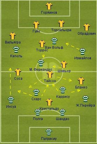 али домашнюю победу над Манчестер Сити в предыдущем раунде. В воротах – молодой, но уже опытный Руи Патрисиу, в сердце обороны – пара бразильцев во главе с чемпионом мира-2002: Андерсон Полга и Шандао. На флангах защиты – проворные Инсуа и Жоао Перейра, в средине поля – номинальный оборонец Каррису и ориентированный на атаку Схарс. Фланги закреплены за техничными Измайловым (справа) и Капелем (слева). В роли наконечника атак – высокий ван Вольфсвинкель, под ним – мобильный Фернандес.