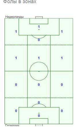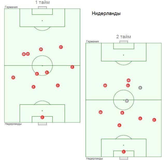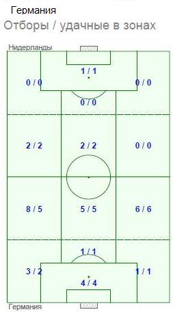 шесть раз и ни разу на своей половине поля. Это говорит не о ее пассивности, а скорее об аккуратности, ведь все осведомлены об умениях Снайдера, ван Перси, Роббена исполнять стандарты, уверенности в своих силах при коллективном отборе. Таким образом успешность обводок соперника была сведена до минимума, а, учитывая доминирование Хуммельса и Боатенга в верховых дуэлях, голландцам вовсе было трудно подобраться даже до штрафной площади немцев.
