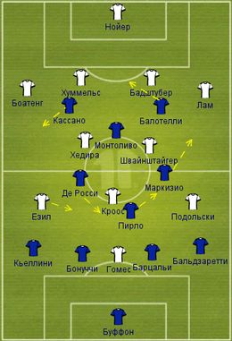 В действительности получается, что при отборе мяча и переходе на чужую половину поля Де Росси опускается ниже всех партнеров по полузащите, Монтоливо и Пирло конструируют креативный дуэт перед ним, Маркизио и Кассано при поддержке фланговых защитников добавляют атакам ширины, а Балотелли остается на острие атак в одиночестве, барражируя на грани офсайда между двумя центрбеками. Вспомните, как создавалась острота у ворот Нойера, как забивались мячи и какие голевые моменты были у того же Маркизио...