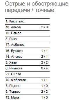 Учитывая, что четверка атакующих футболистов испанской сборной была полностью составлена из игроков, умеющих играть на атаку и отдавать передачи, основным креативным деятелем все равно выступал номинально играющий слева Андрес. И партнеры зачастую искали именно его. Что и говорить, если в графике распределения передач именно напротив него стоят самые крупные цифры. Так, Альба отдал ему 20 пасов, Хави - 18, Хаби Алонсо - 16. Под этот количественный максимум подпадают только пары Альба-Алонсо (20) и Иньеста-Альба (17), все остальные заметно уступают.