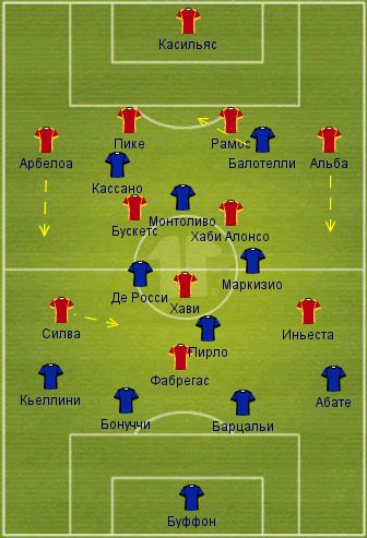 Что касается Скуадры Адзурры, главная загадка заключалась в том, какую формацию выберет их наставник. Напомним, что на стадии группового этапа Пранделли сыграл с испанцами в три защитника и преуспел - Италия свела тот матч к ничьей и к тому же забила первой. Однако в последних матчах очень неплохо себя проявила схема с квартетом защитников и ромбом в центре поля. Именно на нее и была сделана ставка. Возвращение восстановившегося после повреждения Абате сюрпризом не стало - Иньяцио заменил на правом фланге обороны Федерико Бальдзаретти.