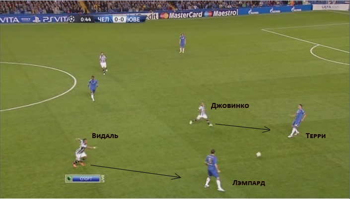 На вышеуказанном фото можно увидеть командный прессинг игроков Ювентуса на чужой половине поля против Челси, в первом матче группового турнира Лиги чемпионов. Джовинко и Видаль активно прессингуют Терри и Лэмпарда. Цель подобного маневра заключается в следующем: