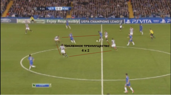 Челси это прекрасно понимал, активно прессингуя туринцев еще на их половине поля. Пирло практически был выключен из игры, потому как рядом с ним постоянно находился игрок, чаще всего Оскар. Его процент передач хоть и был высок, но он за весь матч не выполнил не одной обостряющей передачи, тогда как в среднем Пирло выполняет больше двух острых передач за матч. Постоянно прессингуя, лондонцы не давали Ювентусу тщательно готовить свои атаки. Туринцы, находясь под активным прессингом, должны были быстро переводить мяч на половину поля соперника. Получая мяч, Вучинич и Джовинко были лишены поддержки остальных игроков команды. Все это приводило к тому, что игроки Челси получали значительное численное преимущество над соперником на своей половине поля и с легкостью отбирали мяч. Если у вас есть возможность, пересмотрите еще раз первые двадцать минут матча Челси-Ювентус, чтобц убедиться в этом.
