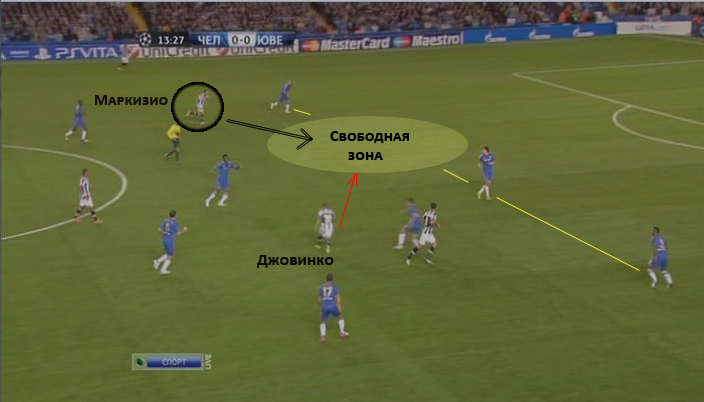 Тут все просчитано до мелочей. Джовинко и Вучинич, располагаясь ближе к правому флангу атаки, отвлекают на себя внимание Терри и Луиса. Два центральных защитника Челси лишены подстраховки и формально должны играть 1 в 1. Вследствие четко продуманного расположения игроков Ювентуса, с целью максимально растянуть оборону соперника и отсутствия прессинга со стороны Челси, это приводит к тому, что в линии обороны лондонцев образуется свободная зона куда мгновенно устремляется Маркизио. Через пару секунд это приведет к опаснейшему моменту у ворот Чеха, который, правда, не стал голевым.