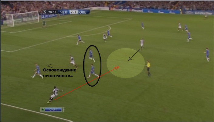 А в этом случае уже Маркизио своим перемещением уводит за собой двух игроков Челси, тем самым освобождая пространство в центе поля для Вучинича, где он может спокойно принять мяч от Асамоа. Стоит упомянуть, что именно Маркизио стал автором двух голевых передач в ворота Челси.