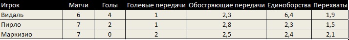 Но особенного внимание заслуживает третий игрок в центе поля Ювентуса – Артур Видаль. Этот игрок - мечта Лобановского. Ведь всем известно, как Валерий Васильевич ценил универсальных футболистов. Видаль – это олицетворение универсального футбольного исполнителя. На поле он умеет все: отбирать, созидать и завершать. Интересно взглянуть на статистику, предоставленную сайтом whoscored.com, трех полузащитников Ювентуса, которые формируют центр тяжести всей командной игры туринского клуба.