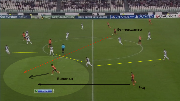 На фото показано начало одной из опаснейших атак Шахтера. Фернандиньо получает мяч в центре поля. Игроки Ювентуса хоть и сужают пространство вокруг полузащитника Шахтера с целью отбора мяча, но его никто не прессингует. Это позволяет ему оценить ситуацию и найти свободную зону на левом фланге атаки. Виллиан прекрасно читает момент, сразу же начиная ускорение. Но самое главное – Рац также начинает рывок в это пространство. Смотрим, к чему это впоследствии привело.