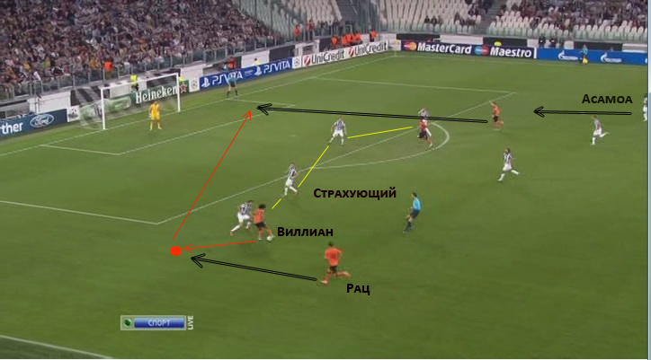 Атака продолжается. Виллиан получая мяч, идет в обводку оппонента, которого страхует партнер по команде. Стоить сделать акцент на том, куда идет в обыгриш полузащитник Шахтера. Он смещается в центр, идя прямо на страхующего игрока, но в то же время это позволяет расширить пространство на фланге, куда сразу устремляется Рац, и через несколько секунд, выполняет острейшую передачу на Мхитаряна, которая, правда, не оказалась результативной. Также стоит отметить в данном эпизоде то, как провалился Асамоа. Он не успел закрыть свою зону на фланге, это привело к тому, что два центральных защитника Ювентуса оказались в положении 1 в 1 против атакующих игроков Шахтера. Можно