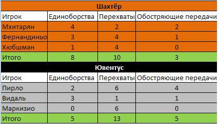 Перед вами показатели игроков по единоборствам, перехватам и обостряющим передачам. Из статистики видно, что трио игроков Шахтера выполнило больше единоборств, чем игроки Ювентуса (8:5), но уступило им по перехватам (10:13). Интересно то, что если суммарно сложить эти оборонительные показатели двух команд, то счет окажется равным (18:18). Стоит отметить результаты Мхитаряна. Генрих хоть и не забил во вчерашней игре, но его объем работы поражает. Этот игрок продолжает расти с каждым матчем, превращаясь в классного футбольного мастера европейского уровня.