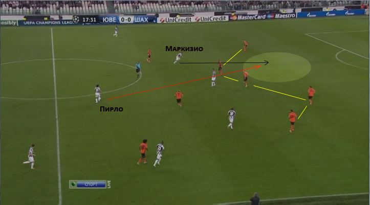 На стоп-кадре показан тот самый момент. Если в первом разобранном нами эпизоде вне прессинга находился Фернандиньо, что позволило ему начать опасную атаку прекрасным пасом, то тут уже Пирло по причине отсутствия прессинга получает кучу времени для оценки ситуации. Игроки Шахтера допускают грубейшую ошибку в построении последней линии обороны. Линия абсолютно не выдерживается. За двумя центральными защитниками образуется свободная зона, куда сразу же устремляется Маркизио. Пирло это прекрасно видит, а для таких мастеров как он, исполнить шикарный пас не проблема. Показательный пример, того как нельзя обороняться.