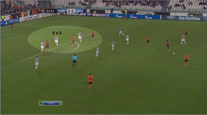 В книге Мартена Мейера «Хиддинк: Гус Всемогущий» великий голландский тренер раскрыл один из своих методов, касающихся того, как нейтрализовать атакующий потенциал фланговых игроков соперника. Заключается он в следующем. Вместо того, чтобы акцентировать свое внимание на оборонительных действиях против вингера соперника, вы должны заставить самого его оборонятся, постоянно нагнетая давление на его фланге. Таким образом, вы нейтрализуете сильные стороны соперника, заставляя его больше думать об обороне, постоянно следя за своей зоной. Шахтер прекрасно нагнетал давление на флангах. В зону Асамоа и Лихтштайнера помимо Раца и Срны очень часто врывались Виллиан и Тейшейра. Из-за этого Видаль и Маркизио вынуждены были смещаться к флангам, помогая своим вингерам, дабы те не оказались в численном меньшинстве 1 против 2, а один из центральных защитников выполнял страховку своих полузащитников, в случае если они были бы отыграны.
