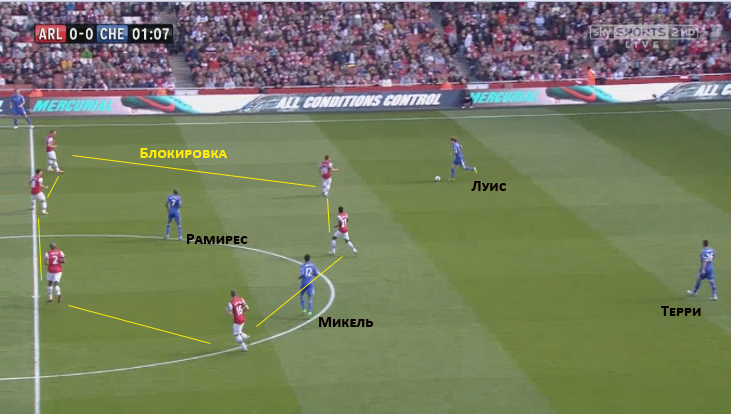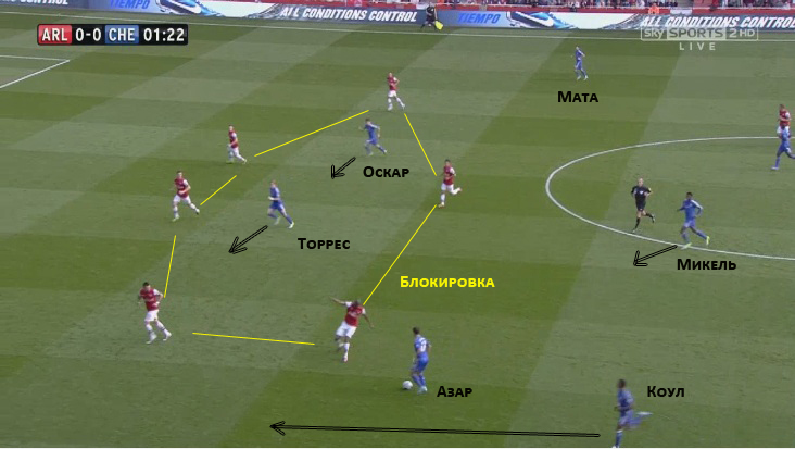 полузащитникам, беря в окружение Торреса и Оскара, блокируя продолжения атаки Челси. Коул хоть и пытается оказать поддержку на фланге, но шесть игроков Арсенала, которые сейчас обороняются, насыщают правый участок поля – зону, где находится мяч, тем самым затрудняя продолжение атаки сопернику через фланг. Стоит акцентировать внимание на левом защитнике Арсенала. Он сохраняет плотность линии защиты, следуя за своими партнерами. Мата сейчас не несет никакой угрозы, и потому остается без опеки. Если игроки Челси смогут доставить мяч на противоположную половину поля – все игроки Арсенала, сохраняя плотность, должны будут переместиться на противоположный фланг для блокировки атаки соперника.
