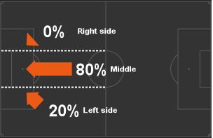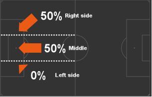 На схеме показано направление ударов в процентном соотношении игроков Челси в игре с Арсеналом. Видно, что угроза в основном исходила с правого фланга и центральной зоны. В игре же с Тоттенхэмом была совсем другая картина.
