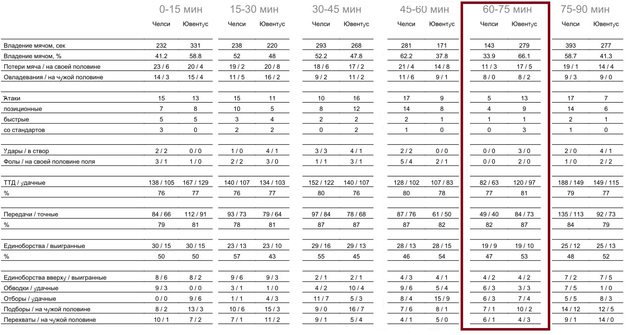Из итоговой таблицы ТТД видно, как слабо команда Ди Маттео провела отрезок игры с 60 по 75 минуты. Показатели практически по всем параметрам значительно упали по сравнению с остальными отрезками матча.