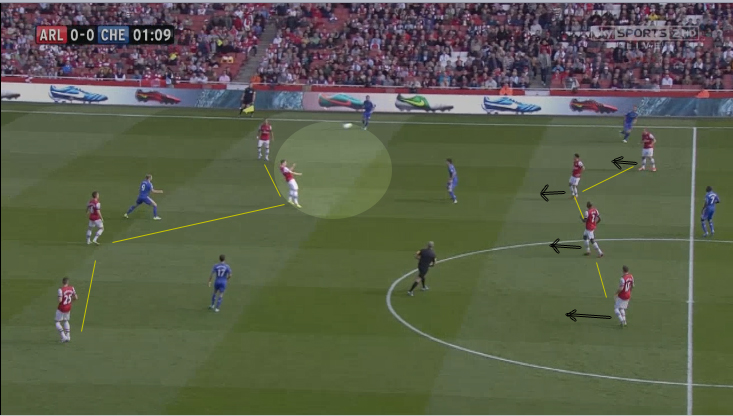 Таким образом, выполняя умеренный прессинг и блокируя возможную зону продолжения атаки в центре поля с помощью сужения пространства, игроки Арсенала своими командными оборонительными действиями подталкивали Челси начинать свои атаки, применяя дальние передачи со своей половины поля. С учетом слабостей атакующих игроков вести верховую борьбу – это был не самый приемлемый способ доставки мяча на половину поля соперника для команды Роберто Ди Маттео, так как игроки не могли цепляться за него после длинных верховых передач.