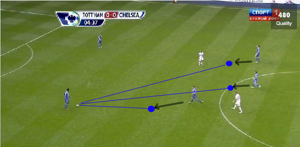 На фото видно, как три игрока Челси активно смещаются к своим защитникам для получения мяча. Стоит отметить также позиции двух последних игроков Челси. Они умышленно располагаются ближе к своей штрафной, таким образом расширяя пространство на своей половине поля. В такой ситуации игроки передней линии Тоттенхэма не могут прессинговать игрока, владеющего мячом, так как, выдвигаясь на защитников Челси, они предоставят во владение трем игрокам соперника очень много пространства в центре поля, которое они могут с легкостью использовать для продолжения своей атаки.