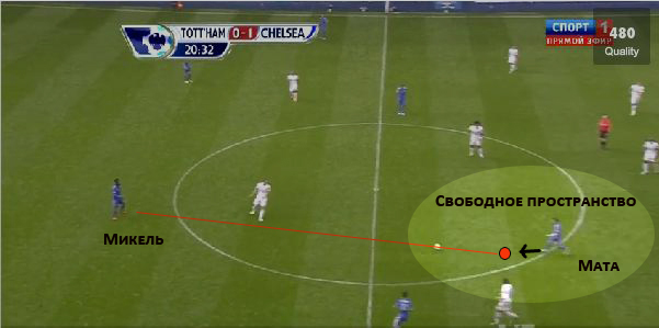 А на этом примере игроки Челси используют ошибку Тоттенхэма при построении начальных редутов. Обратите внимание, что в построении игроков Тоттенхэма нет той плотности, которая была присуща построениям Арсенала. Мата с легкостью находит пространство между игроками соперника, сразу направляясь в свободную зону для получения мяча от Микеля и продолжения атаки своей команды.
