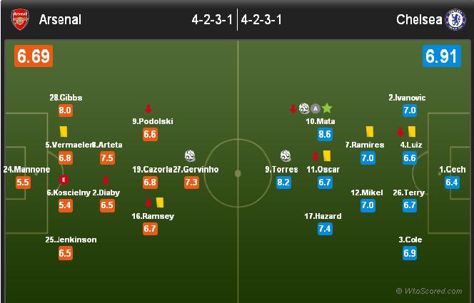 На схеме показано, как выглядела расстановка игроков Челси в игре с Арсеналом. Формально это 4-2-3-1.