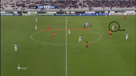 На данном кадре показано, как Кучер следует за игроком Ювентуса, на которого направлена передача, ограничивая его во времени. Игрок Ювентуса должен обладать большим футбольным талантом, чтобы правильно оценить, что происходит на поле да еще все четко исполнить. Правильное выполнение этого оборонительного приема сводит к минимуму продолжение атаки вперед, когда мяч попадет на половину поля обороняющийся команды. Дело в том, что в подобных эпизодах атакующие игроки чаще всего стараются избегать риска и для этого сбрасывают мяч назад ближайшим игрокам. Скидка мяча – это также передача, которая сопутствует продолжению атаки, но она гораздо менее опасна, чем, например, острая передача, которая направлена вперед. Если бы в данном эпизоде Кучер не прессинговал игрока Ювентуса, то он имел бы возможность беспрепятственно получить мяч от своего партнера по команде, развернуться и продолжить атаку путем передачи вперед или быстрым движением на ворота Шахтера.