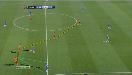 Обратите внимание, как Срна и Тейшейра контролируют своих оппонентов. Игроки Шахтера активно играю в обороне, готовы сразу вступить в отбор мяча, как только передача будет направлена в зону, где находятся игроки Челси, против которых они защищаются.