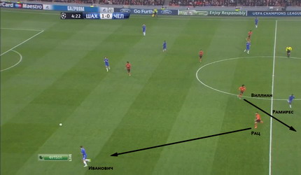 А в этом случае Рац (!) ускоряется для атаки Ивановича на чужой половине поля. Допустил ли Разван тактическую ошибку, оставив свою зону на левом фланге обороны и перейдя к прессингу соперника далеко на его половине поля? Не знаем. Пожалуй, лучше всего на этот вопрос может ответить Мирча Луческу. Можно лишь с уверенностью сказать, что в таких случаях всегда оставленную зону должен занимать другой игрок обороняющейся команды. Обратите внимание на Виллиана. Он еще до приема мяча Ивановичем, замечает Рамиреса, который направляется в зону, оставленную Рацем на левом фланге обороны, и сразу ускоряется за полузащитником Челси, блокируя продолжение атаки лондонского клуба через свой фланг. Современный атакующий полузащитник должен уметь хорошо обороняться, причем не только путем вступления в силовые единоборства, а с помощью своевременного прикрытия открытых зон. Для этого нужно постоянно следить за тем, что происходит на поле. Ни в коем случае нельзя концентрировать свое внимание исключительно на игроке, владеющим мячом.