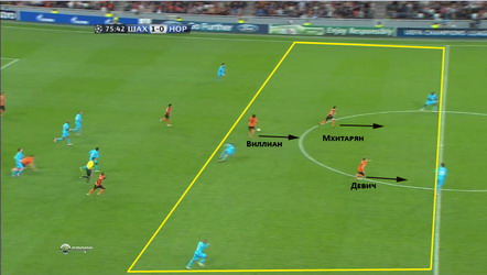 Мяч перехватывается игроками Шахтера и доставляется на Виллиана в искусственно созданное игровое пространство. Практически все игроки Норшелланда выключаются из игры из-за быстрого перехода от обороны к атаке. Формально сейчас игроки Шахтера получают численное преимущество 3 против 2. Также очень важно то, что Виллиан, Мхитарян и Девич получают необходимую территорию, которая была создана искусственно. Через пару секунд счет на табло стал 2:0.