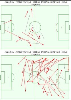 Удивительно, но провальным для аргентинца оказался первый тайм. Наверняка Мирон Маркевич ожидал, что Хосе сможет достойно заменить Шавьера в центре поля, однако вести игру с таким же успехом Сосе не удавалось. Во втором тайме он заметно преобразился (обратите внимание на график передач по таймам), однако эффективности по-прежнему было немного - в итоге всего одна острая передача и ни одной обостряющей за 95 сыгранных минут.