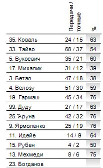 В итоге показатели точности передач у украинской команды оказались шокирующе низкими - 37% брака! Да играющие на область команды ошибаются реже! А здесь - вице-чемпион страны, играющий в групповом раунде Лиги чемпионов. Что и говорить, если у киевлян только три футболиста (Ярмоленко, Аруна и Гармаш) превысили 75-процентный показатель точности передач...