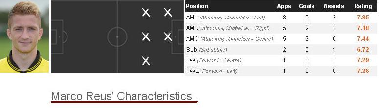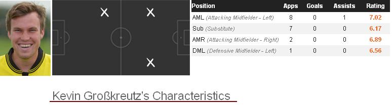 Крайние полузащитники: 11. Ройс; 15. Блащиковски; 19. Гросскройтц. Марко играл во всех играх, а Куба и Кевин заменяли друг друга. Нужно отметить универсализм Ройса и Гросскройтца. Марко может играть на любой позиции в атаке, а Кевин имеет навыки игры на обоих флангах полузащиты. Это видно из нижеприведенной статистики, предоставленной сайтом whoscored.com, где указываются все позиции, на которых играли эти игроки в этом сезоне на данный момент: