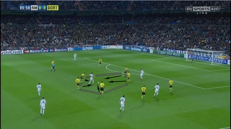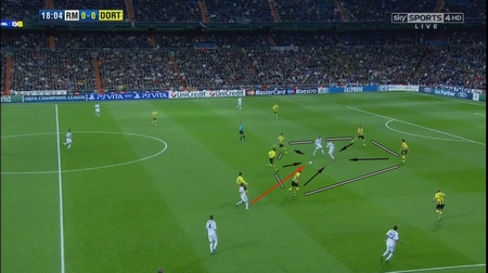 Именно это и происходит на данном стоп-кадре. Но есть еще один интересный нюанс. Обратите внимание, что оказывают прессинг на игроков Реала только полузащитники Боруссии. Два центральных защитника, Хуммельс и Суботич, только слегка поджимают соперника сзади. Вероятно, существует опасность быть быстро обыгранным в случае безрассудного броска вперед на игрока с мячом, тем самым открыв зону за своей спиной.